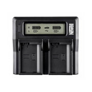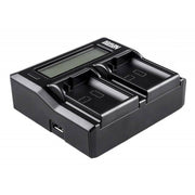 The built-in LCD display shows the percentage of charge of each battery, as well as the selected charging mode. The unit can operate in normal 'L' and fast 'H' modes.
