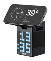 The Newell All-in-One Charging Station is a multifunctional desk companion combining wireless charging, a Bluetooth speaker, pixel art display, and a digital clock. Charge your iPhone (MagSafe), Apple Watch, and earbuds simultaneously with Qi compatibility. Customise LED animations, set alarms, or play music with RGB lighting that reacts to sound. It features Bluetooth 5.3, stereo sound, a 110-LED colour screen, and an aluminium housing. USB-C powered with a built-in battery for wireless clock and speaker use, it's the perfect gift for tech lovers and design enthusiasts.